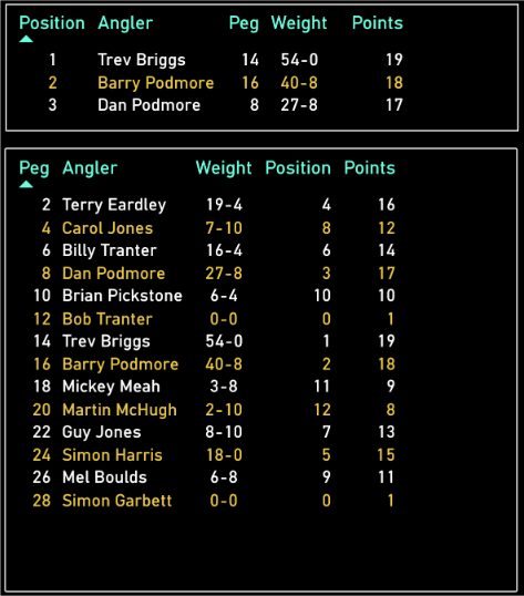 Our fishing challenge was further amplified when the bailiff visited each of us at our pegs and kindly asked that if we caught a barbel we return it to the water immediately – we decided not to weigh them in. Spawning carp and No barbel. Trev said he got the carp going up in the water for the last 2 hours of the match to win it with 54-0 and move up to second on the leader board. Barry was a close second weighing in with 40-8 and Dan framed in third with 27-8.
