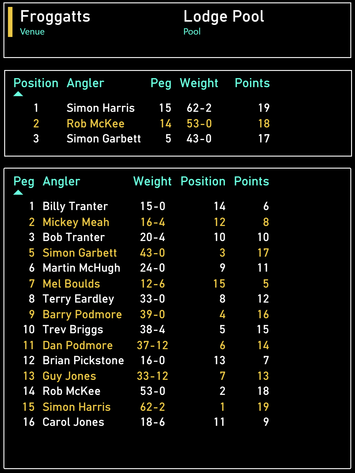Guy remains on top of the leader board followed by Terry who is 9 points behind. We weighed in a total of 462lb at this match.