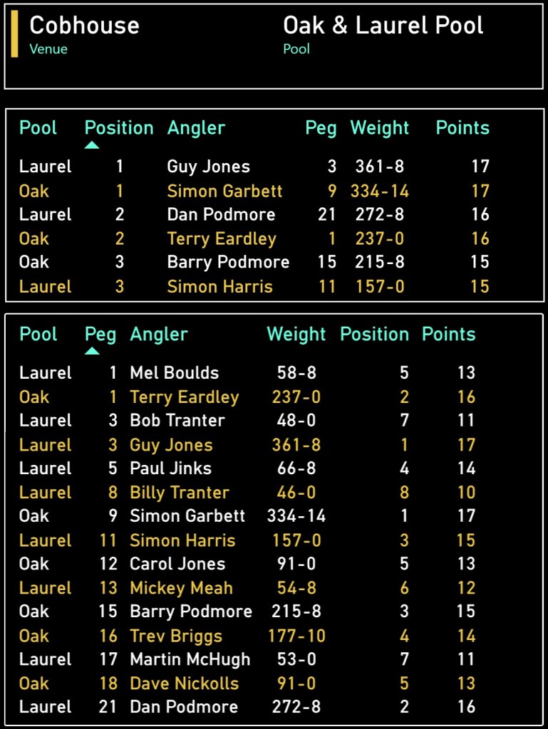 Dan was having similar success, and they were both filling their nets throughout the entire match. Over on the Oak pool, Simon, Terry and Barry were emptying the pool.