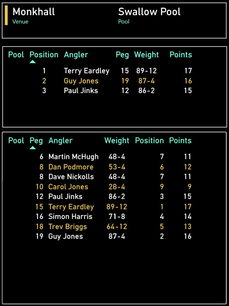 Match 14 – Monkhall 19/09/2020 Posted on 08/10/202009/10/2020 by mbb Swallow Pool 11 fished Apologises that there is no report, as I was on holiday. Individual Result PositionAnglerPegWeight1Terry Eardley1589-122Guy Jones1987-43Paul Jinks1286-2 Like Loading... Related