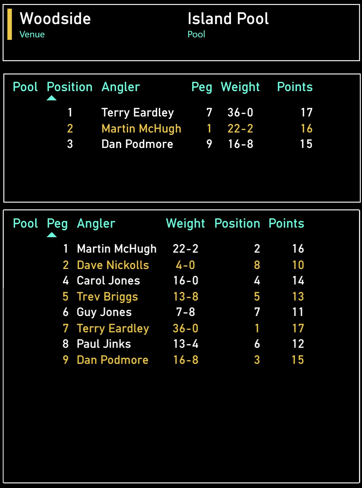| Position | Angler | Peg | Weight |