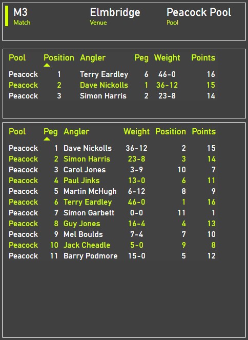 So it was over to the venue expert Terry to lead the way from peg 6 but only putting 46lb in his net, no where near the 100lb that we know the pool is capable of. Dave kept his run of form going from peg 1 challenging the lead right from the all-in with 36lb, that’s two successive second places for him. Simon Harris completed the frame from peg 2 with 23lb. Guy still retains his lead at the top of the leader board after three matches.