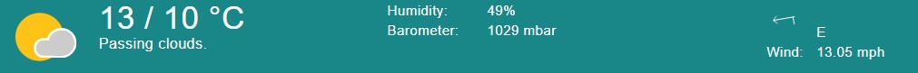 Cold start, developing into a cloudy day with a high temperature of 13C and a low of 10C with an Easterly breeze of 13mph.
