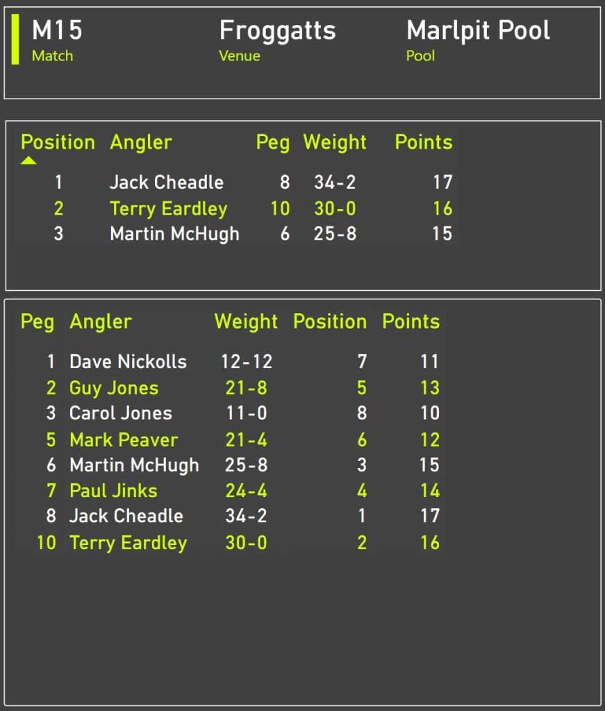 Well done Jack who put 34-2 on the scales to take first place in the frame. Terry continued his excellent form to take second place with 30-0 and extend his points advantage on the leader board. Martin finished in third place with 25-8.