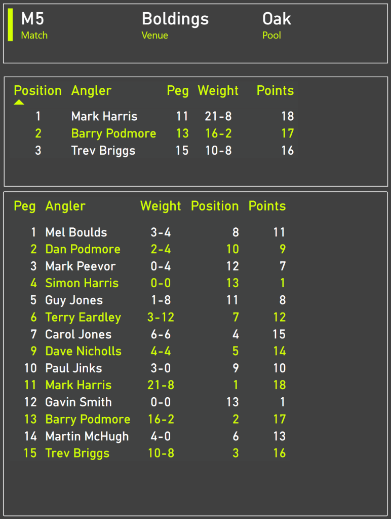 Two match seconds in a row for Barry, who despite the poor form of the venue managed to detect the shiest (is that spelt right) of bites, and switching baits, finding that maggot was the only bait that would produce a tiny dink on the float, resulting in a fish. Peg 11 was a winner again two matches in a row, and Mark Harris was switching between shallow rigs and he margin to eventually take first place in the frame, his second win of the season.