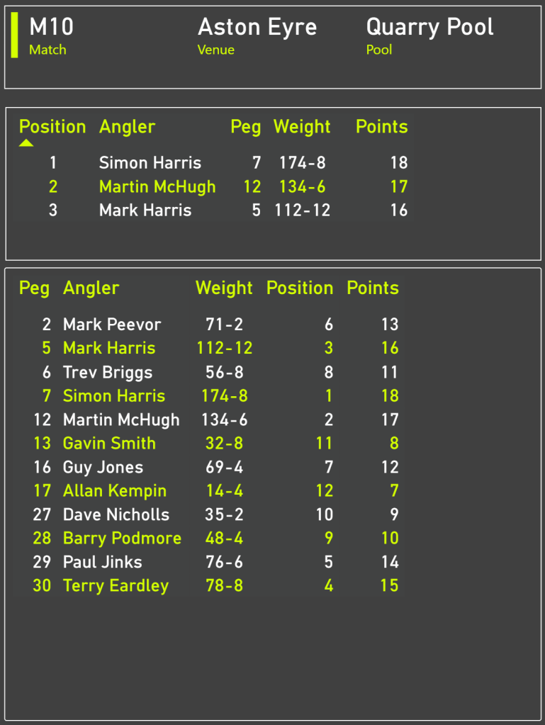 Once again Aston Eyre provides the match of the season (so far). Needing more than 100lb to frame, and with the usual choice pegs being unfavoured by the wind, it was Simon Harris on peg 7 who was kept busy and finally took the honours weighing in 174-8, the highest match weight this season. Martin was also kept busy on peg 12 who finished in second place with 134-6 which included a big carp weighing 16-2 which is currently the biggest individual fish caught this season. In third place was Mark Harris, who put 112-2 on the scales to close the gap at the top of the leader board.