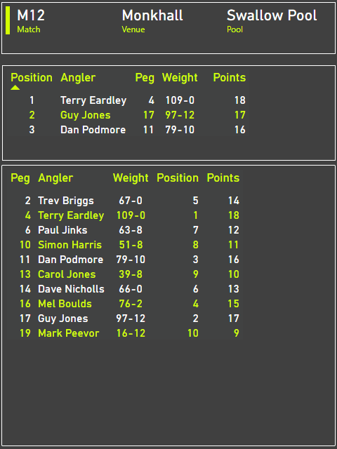At the weigh in Terry took the honours for his 4th win of the season with 109lb mainly caught down the edge. Guy was second on his comeback with 97lb mainly caught rotating between a short line deep and pellet feeder. While Dan completed the frame with 3rd place from peg 11. That sees Terry extend his lead at the top of the leader board.