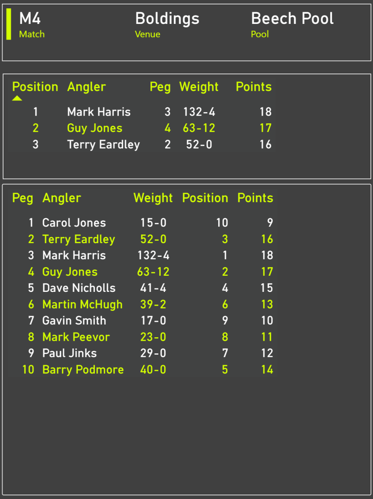 Match 4 – Boldings 07/05/2023 Posted on 09/05/2023 by mbb Beech Pool 10 Fished We weighed in a total of 479lbs or 205kg 🙂. Individual Result PositionAnglerPegWeight1Mark Harris3132-42Guy Jones463-123Terry Eardley252-0 Share this:TweetMore Email a link to a friend (Opens in new window) Email Like Loading... Related