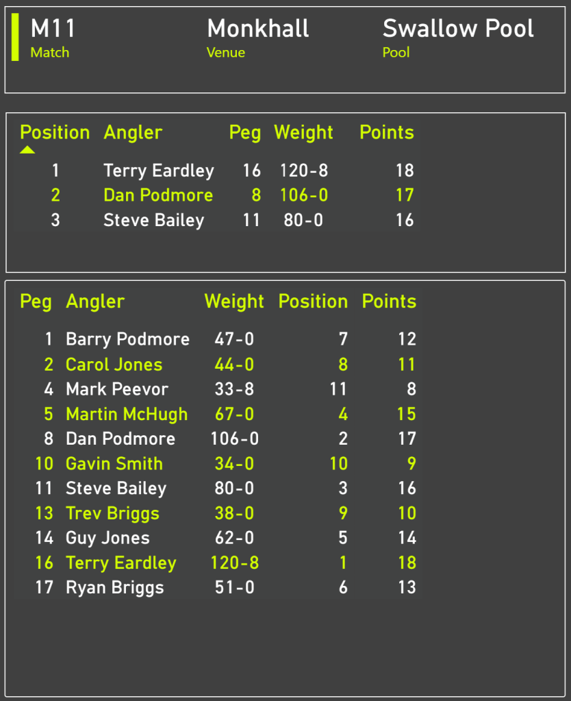 The weather started off well, but rain and wind later set in, creating a typical day at Monkhall. Some notable catches included Dan’s performance on peg 8 (106-0) and Wayne on peg 7 (109-4), where they had a close battle, but Wayne ultimately emerged as the victor. Steve, on peg 10, had a successful day too, with 30lbs of Ide caught up in the water, marking his best result for the year so far. It seems like most participants had fish in their swims, but had difficulty hooking them. Fishing can always have its challenges!