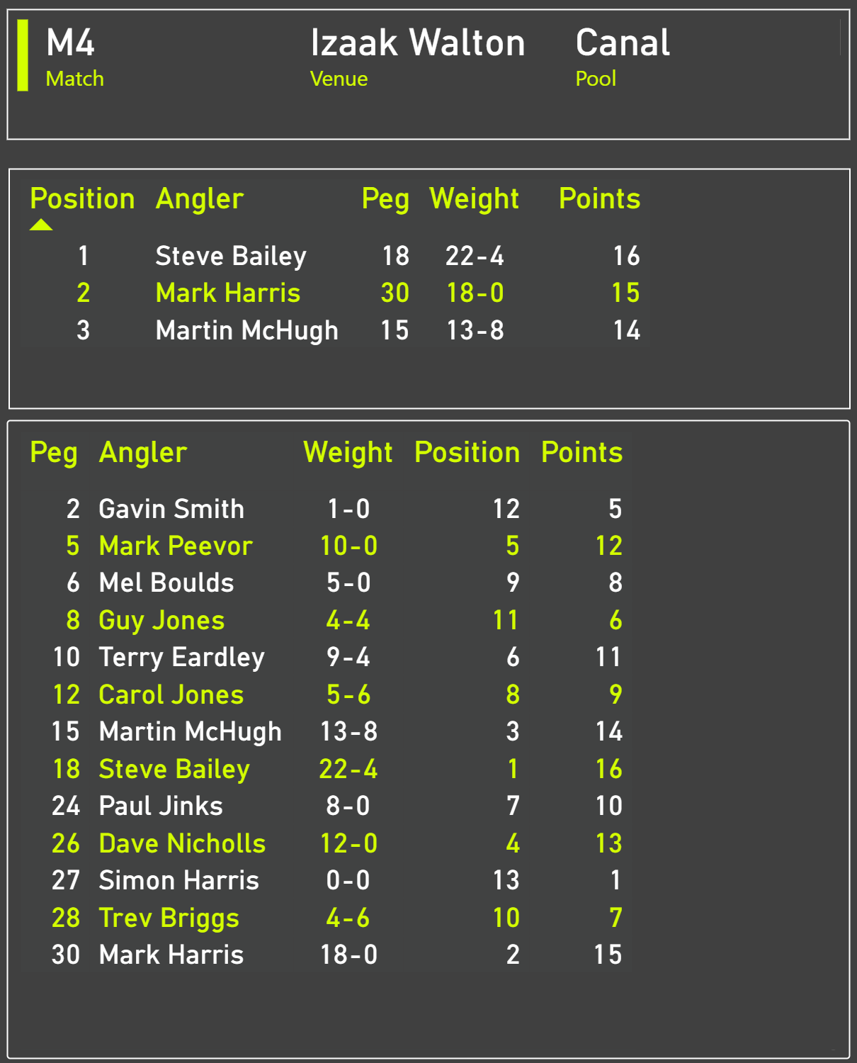 Steve Bailey emerged as the victor, conquering peg 18 with a weight of 22lb 4oz. Mark Harris followed closely behind, securing second place with 18lb. Martin claimed third with 13lb 8oz.