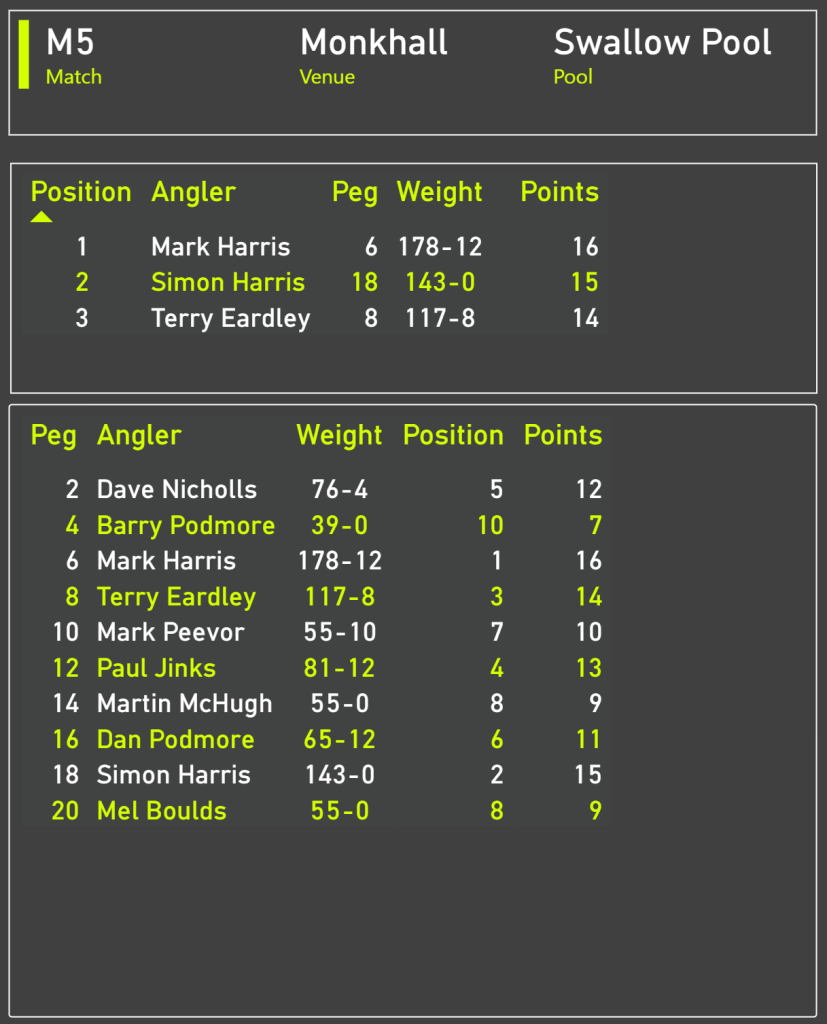 The latest match at Monkhall Swallow Pool delivered an impressive set of results, much to the delight of all participants. Anglers enjoyed a productive day, with plenty of fish caught primarily on the short pole line using either caster or pellet. You needed over 100lb to make the frame!