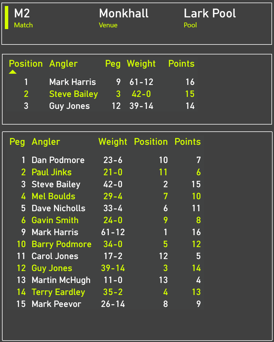 The second match of the season saw a shift in the weather, with a gusting breeze making the fishing conditions a little more challenging at Monkhall Fishery on the Lark Pool. Despite the weather, the fishing action was far from disappointing.
